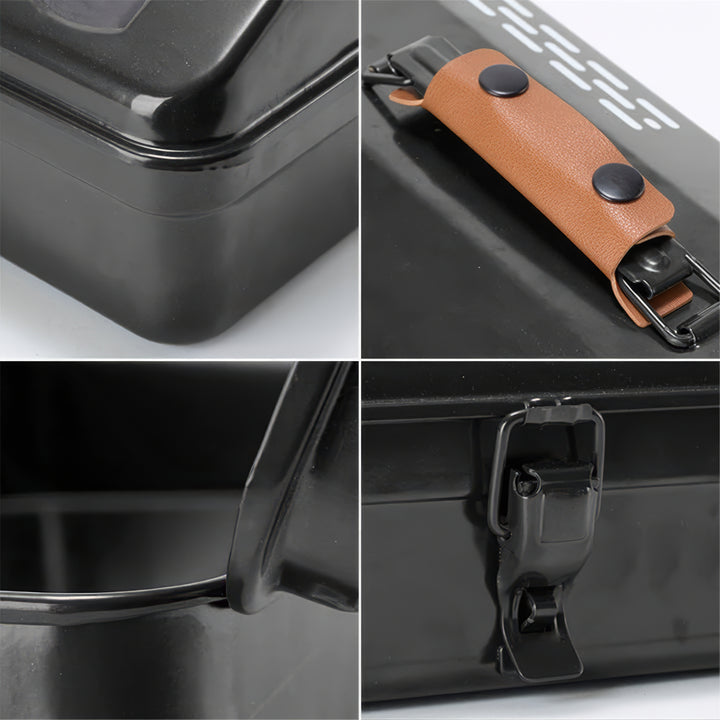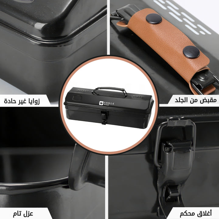 حقيبة شاهي معدنية فاخرة للرحلات والمكشات محموله بمقبض جلد وحماية داخلية سهلة الحمل هدية فاخرة وأنيقة لعشاق الشاهي الأصيل تجربة شاهي فاخرة. لون اسود
